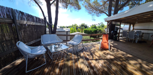 Das Mobilheim hat ca. 32 m² Fläche. Die Terrasse hat nochmals ca. 40 m² mit einem schönen Blick aufs Wasser.