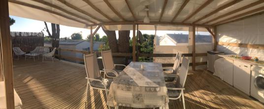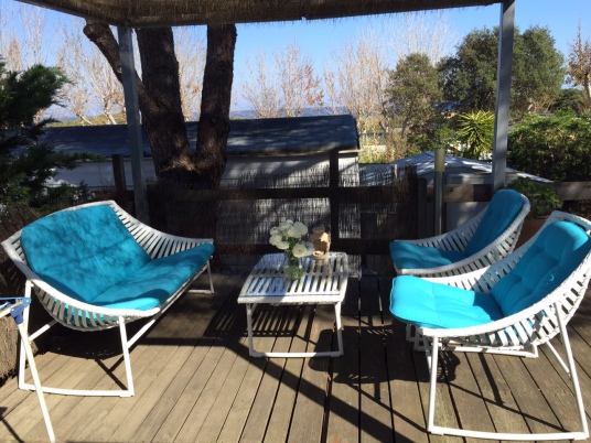 Verfügung. Hier kann man tagsüber ausruhen, an den warmen Sommerabenden kann man relaxed seinen Drink geniessen. Daneben gibt es auch eine kleine Aussendusche. Dies für all diejenigen, die sich