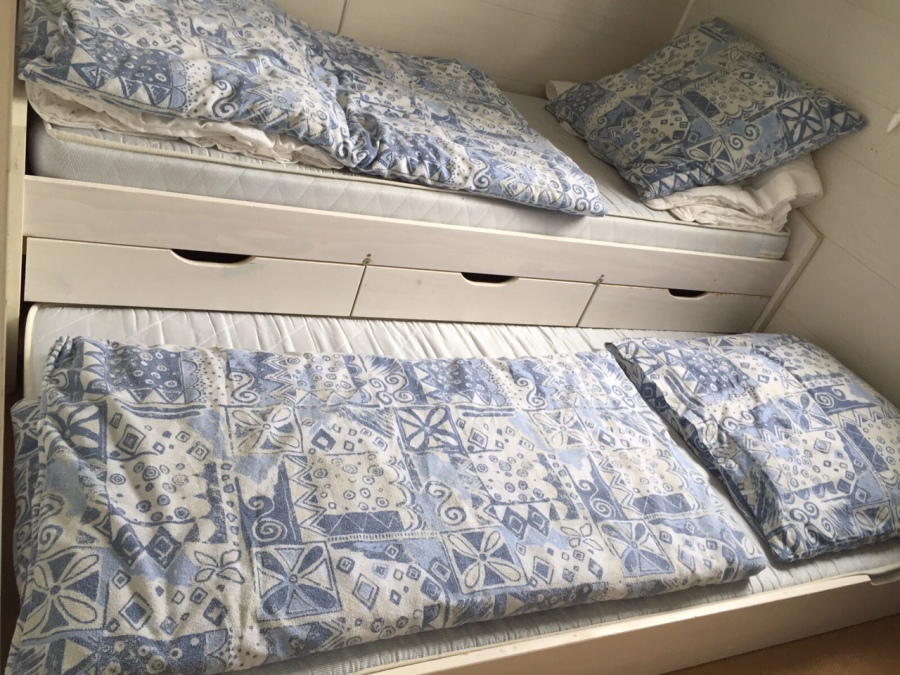 Ein Zimmer hat ein Doppelbett (160x200) und ein Zimmer ist mit einem Ausziehbett (2 x 90x200) ausgestattet.